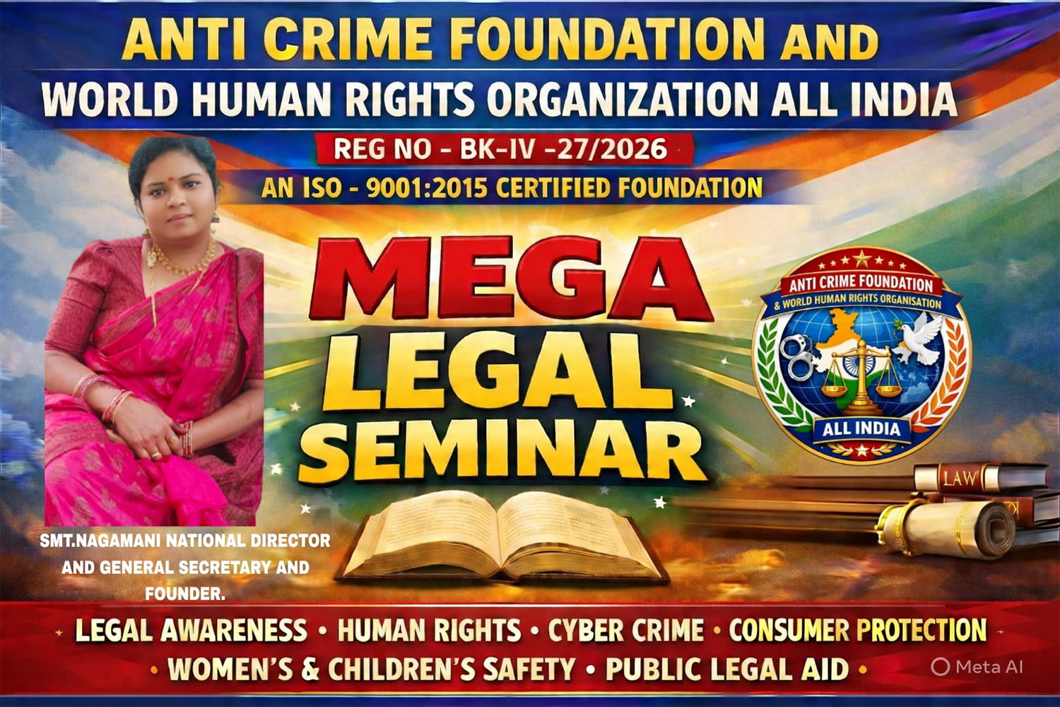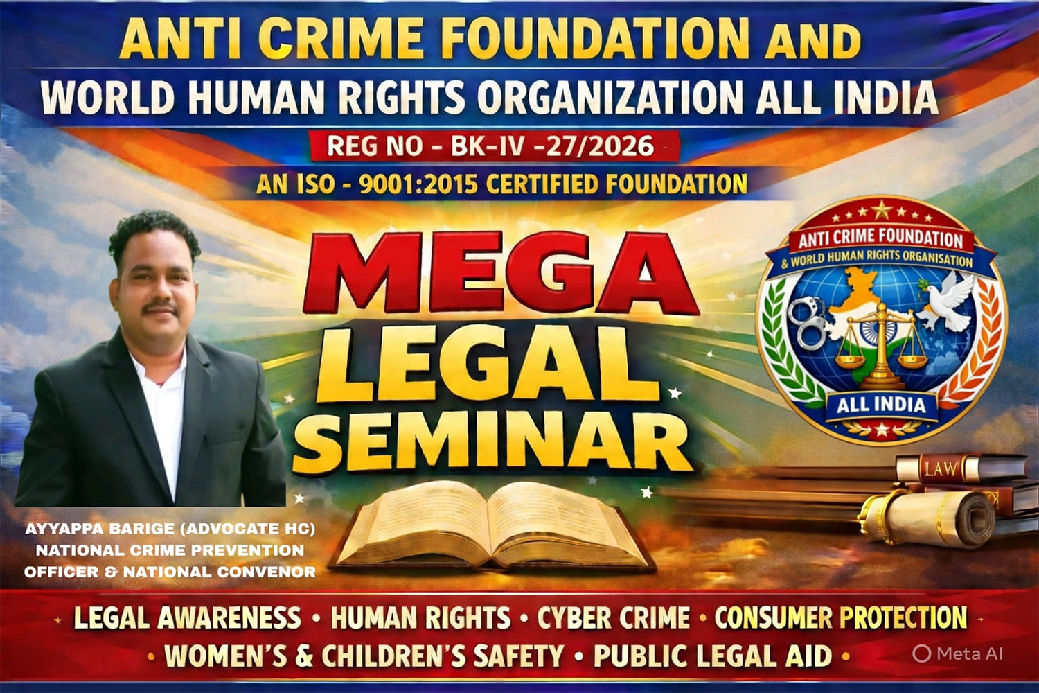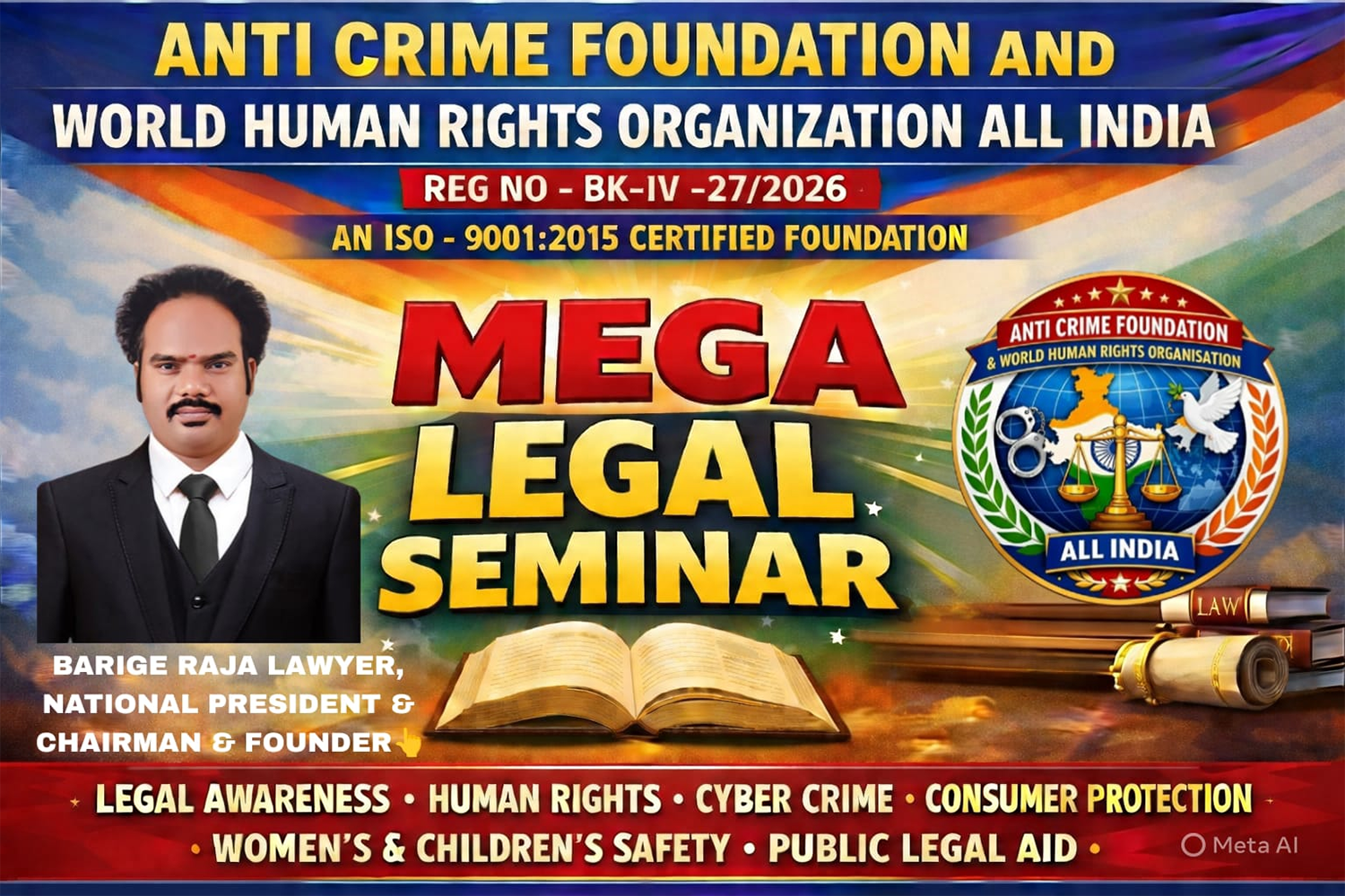 Anti Crime Foundation & World Human Rights Organization – All India • Reg No: BK-IV-27/2026 • Legal Awareness • Crime Prevention • Human Rights Protection • National President: Barige Raja • National General Secretary: Smt. Nagamani •